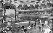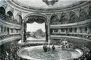 The theatre was 76 ft wide and 130 ft in length and had three entrances: the Grand entrance was wide and roomy with arches to support the ceiling and was decorated in the Pompeian style. An 'extremely handsome stone staircase' with carved balustrades lead to the boxes. All three entrances were fireproof and all the staircases were constructed of stone; especial care was taken to provide facilities for clearing the building in a few minutes in case of fire, while various doorways and entrances were also fitted with steel shutters.[3] Inside, the width across the auditorium from box to box was 60 ft, while the Royal Box was located in the centre of the house facing the stage, with its retiring room immediately behind. There were no stage boxes as the architect discovered that anyone seated in the second row in a stage box would not be able to see the stage or the ring of the amphitheatre. Instead, Smith used a different design, placing the dress circle at the side where the private boxes would normally have been placed, and put the private boxes in front of the house. Also, Smith placed one row of stalls holding 200 patrons with flip-up seats in front of the 26 private boxes which ran entirely round the house. The amphitheatre held about 700 people. The front row in the gallery held 150 stalls, with each seat having a stuffed cushion with a comfortable back. The remainder of the gallery seated about 550 people with standing room for about 200 more and had a large promenade fifteen feet wide behind. The stage was only 20 feet deep, but the owners considered this adequate for the type of plays they intended to stage. Before the stage was the orchestra pit from which music could be provided for both dramatic performances on the stage and equestrian displays in the ring. A crystal sunlight 9 feet in diameter and holding 900 gas burners was designed to illuminate the whole auditorium.[1][2]