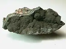 Hollandite (chemical formula: Ba(Mn4+6Mn3+2)O16) is a manganese oxide mineral.[2] Its structure consists of double chains of MnO6 octahedra delimiting 2 × 2 tunnels. The electrostatic charge created by the Mn3+ for Mn4+ substitution is balanced by cations in the tunnels. Their nature determines the mineral species: Ba for hollandite, K for cryptomelane, Pb for coronadite, Sr for strontiomelane,[3] Tl for thalliomelane,[4] and Na for manjiroite.[5] Pure species are rare and most 2 × 2 tectomanganates contain mixtures of several types of tunnel cations.