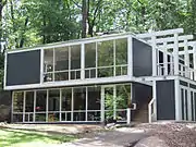 Davenport hired D.C.-based architect Charles M. Goodman (who also designed the Washington National Airport) to design the community; Goodman hired landscape architect Lou "Barney" Voigt to his firm in 1950.[10][11] Together, the trio of builder/developer, architect and landscape architect chose to design each home with lots no smaller than one-third of an acre. Between 1949 and 1961, Charles Goodman designed eight modern unit types with variations in square footage and interior amenities, comprising 15 different combinations for Hollin Hills.[1] During construction, many trees were retained to block sight lines, and houses were built at angles to ensure privacy. The popularity of the homes, which feature huge expanses of glass, established Goodman as a nationally acclaimed guru of modern architecture.[12][3] Davenport named some streets to complement the community name, while others were named after family members: Martha's Road for his mother and Rebecca Drive for his daughter. Elba Road was named after one of his prize bulls.[13]