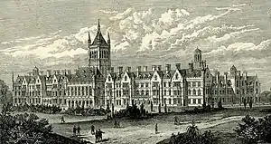 In 1872 that Holloway met with the Commissioners in Lunacy, who entered warmly into his plans and promised every assistance to produce a model building. He expressed some quite fixed feelings about architecture but was no expert and was assisted by Professor T. L. Donaldson and T. H. Wyatt (who were architects for the Commissioners in Lunacy). Donaldson (1795–1885) was a foremost architect, the first Professor of Architecture at University College London, co-founder of the Royal Institute of British Architects (RIBA), and its President in 1863-4. Thomas Henry Wyatt (1807–1880) similarly, who had been President of RIBA in 1870. Both Donaldson and Wyatt received some recompense for their services, the former 100 guineas and the latter 25 guineas. Holloway had a third adviser, George Godwin, editor of The Builder. Holloway's initial idea was that the design of the building should be purely Italian, modelled on the river frontage of Somerset House. However, by October 1871 he had had a change of heart and wrote to Donaldson: “You will see that I have gone into the grand old Flemish style. I know that your taste is classical and which I greatly admire, but perhaps all things considered the Gothic would be most appropriate, as we can get red brick in the neighbourhood and a large building in the Italian style ought, I believe, to have stone facings”.[3]