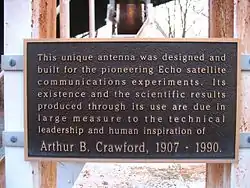 The horn antenna at Bell Telephone Laboratories in Holmdel, New Jersey, was constructed on Crawford Hill in 1959 to support Project Echo, the National Aeronautics and Space Administration's passive communications satellites,[8][5] which used large aluminized plastic balloons (satellite balloon) as reflectors to bounce radio signals from one point on the Earth to another.[9]