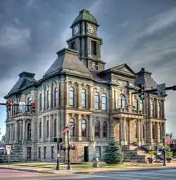 Constructed by Newark builders Hibbert and Schaus according to a design by J.W. Yost, this three-story courthouse comprises such elements as rough stone walls with smooth trim, a colonnaded porch with Ionic columns surrounding the main entrance, and a prominent pediment on the northern side.[4] From its completion until the 1950s, the courthouse featured a statue of Lady Justice located atop the northern pediment, but its deterioration led local officials to place it in storage for many years until area lawyers paid for its restoration. Lesser elements of the building's architecture include steel details, ornamental columns and pilasters closer to the mansard roof, plastered ceilings, a state of Lady Justice in the center of the tiled floor in the building's lobby, and towers on the courthouse's corners.[2]: 107 A prominent clock is located in the tower of the courthouse.[2]: 106 Today, the Holmes County Courthouse remains the county's center of government. Courtrooms in the building serve as meeting places for the Holmes County Court of Common Pleas, along with other courts. Because of the county's exceptionally large Amish population, the courthouse features a parking area with use restricted to horses and buggies.[3]