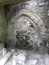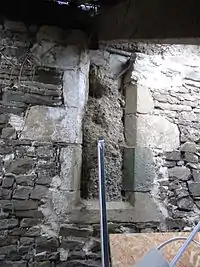 The Chapel of the Holy Trinity at Umberleigh is a ruinous mediaeval chapel in north Devon, England, largely demolished according to Lysons (1822)[3] in about 1800. It stands next to Umberleigh House, the manor house of Umberleigh, which still survives in the form of a large Georgian farmhouse. The ruins together with the adjoining Umberleigh House were granted a Grade I listed status on 25 February 1965.[4] According to Tristram Risdon (d.1640) the Devon historian, the site was originally a royal palace of the Saxon King Athelstan and was later a mediaeval mansion house by successive inheritance of the Solery (or de Soligny), Champernoun, Willington, Beaumont and Bassett families.[5] The chapel, manor house and estate of 400 acres with 7 cottages is today the property of the Andrews family, which purchased the freehold of the property in 1917 but had been long-standing tenants of the Bassett family from about 1840.[6] The south wall of the chapel survives and today forms the back wall of an outbuilding used for general storage.