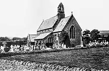 Holy Trinity was built using local stone and flint, with Ham stone dressings, quoins and buttresses, in an Early English style.[2] Able to accommodate 400 persons,[12] it was made up of a nave, a chancel with small vestry, two side aisles, and a north and south porch.[3] The circular pulpit was built of English oak on a base of Ham stone, while the octagonal font and its base was also carved from Ham stone. The reredos were carved in Caen stone, with marble pillars and a Ham stone ledge, and the pews of pitch pine.[2] Since becoming redundant, the church's bellcote has been removed but originally contained a single bell.[13]