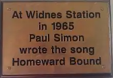 During his time in England, Simon met Kathy Chitty, who was working as a ticket-taker at the club. The two hit it off instantly, but it became clear that Simon desired to perform in London, resulting in an emotional farewell.[3] Following a performance in Widnes, Simon was dropped off at Widnes railway station for a train to his next gig in Humberside.[4] He had been missing Chitty and he began to write "Homeward Bound" on a scrap of paper.[5] A plaque commemorating the song is displayed on the Widnes station platform.[6]