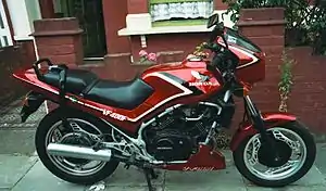 The Honda VF400F (NC13) is a naked or standard motorcycle with a 400 cc (24 cu in) four-stroke V4 engine produced by Honda in 1982 and 1983. It had inboard ventilated disc brakes, Honda's torque reactive anti dive control (TRAC) system and air-assisted front and rear suspension.
