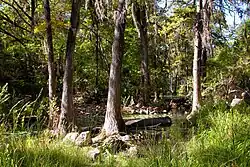 The dry rocky uplands are dominated by Ashe juniper, live oak, agarita and Texas persimmon. Cedar elm, Spanish oak, pecan, walnut and Mexican buckeye are found nearer the creek bed. In the floodplain, the dominant trees are sycamore and bald cypress. Texas palmetto, columbine and maidenhair fern grow along the banks of the creek.[3]