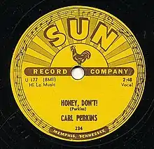 "Honey Don't" is a song written by Carl Perkins, originally released on January 1, 1956[2] as the B-side of the "Blue Suede Shoes"[1] single, Sun 234. Both songs became rockabilly classics. Bill Dahl of Allmusic praised the song saying, "'Honey Don't' actually outclasses its more celebrated platter-mate in some ways."[3] It has been covered by more than 20 other artists, including the Beatles, Ronnie Hawkins and Johnny Rivers.[4] The song has appeared in the films Prince of Tides, Diner, and Perfect Sisters.