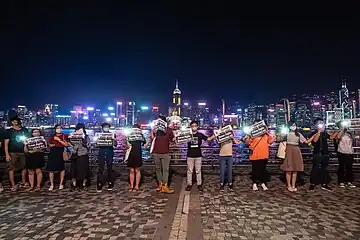 The Hong Kong Way was a peaceful political campaign held in Hong Kong on 23 August 2019, the 30th anniversary of the Baltic Way.[3][4] The goal was to draw people's attention to the 2019 anti-extradition bill movement and the protesters' five demands for government accountability and democratic reform. Organisers estimated that 210,000 people participated.[5][6] In the early night time hours, Hongkongers joined hands to create a human chain of 50 kilometres long on both sides of Victoria Harbour, along the three main MTR lines and over the top of Lion Rock, without any disruptions to traffic.[7][8][9][10]
