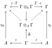 In mathematics, in the theory of Hopf algebras, a Hopf algebroid is a generalisation of weak Hopf algebras, certain skew Hopf algebras and commutative Hopf k-algebroids. If k is a field, a commutative k-algebroid is a cogroupoid object in the category of k-algebras; the category of such is hence dual to the category of groupoid k-schemes. This commutative version has been used in 1970-s in algebraic geometry and stable homotopy theory. The generalization of Hopf algebroids and its main part of the structure, associative bialgebroids, to the noncommutative base algebra was introduced by J.-H. Lu in 1996 as a result on work on groupoids in Poisson geometry (later shown equivalent in nontrivial way to a construction of Takeuchi from the 1970s and another by Xu around the year 2000). They may be loosely thought of as Hopf algebras over a noncommutative base ring, where weak Hopf algebras become Hopf algebras over a separable algebra. It is a theorem that a Hopf algebroid satisfying a finite projectivity condition over a separable algebra is a weak Hopf algebra, and conversely a weak Hopf algebra H is a Hopf algebroid over its separable subalgebra HL. The antipode axioms have been changed by G. Böhm and K. Szlachányi (J. Algebra) in 2004 for tensor categorical reasons and to accommodate examples associated to depth two Frobenius algebra extensions.