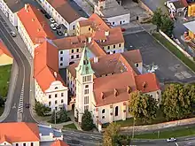 The Minorite Monastery was founded in 1501. A chapel from 1330 was rebuilt into the Church of the Virgin Mary. The late Gothic monastery complex was rebuilt in the Baroque style in 1685–1709. The church tower was added in 1935. After the monastery was abolished in 1814, the building was bought by the order of Notre Dame Sisters in 1855. For almost 100 years it was the seat of the order for the whole country. After the Velvet Revolution in 1989, the order returned.[4][14] Currently, a monastery school and a secondary vocational school are located on the premises.[5]
