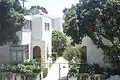 Horatio West Court divides its narrow lot symmetrically, placing two units on either side of a driveway that runs the length of the lot to a rear parking area, where two garages are topped with little apartments.[3] Each building is a slightly inflected, flat-roofed two-story cube to which a small entrance porch and a walled terrace has been added. The arched entry ways and small patio courts reflect Gill's affinity for the Mission Revival style.[4] However, the buildings themselves fall squarely into the Modern Movement.
