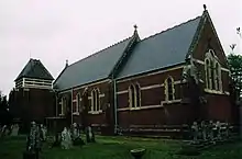 Several illustrations of the old church are preserved at the vicarage and show it to have consisted of chancel, north and south transepts with chapels, nave and central bell turret.[3] The south door at least was of 12th-century date.[3] The present parish church, All Saints, was built in 1872 and succeeded a previous building on the same site dating from 1830.[5] The church’s organ case dates to 1877 and was designed by John Francis Bentley.[16]