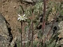 Horkelia hispidula is a species of flowering plant in the rose family known by the common name White Mountains horkelia. It is endemic to the White Mountains, a small mountain range that straddles the border between California and Nevada east of the Sierra Nevada. It is a resident of dry scrub and alpine and subalpine forest habitat. This is a perennial herb producing a low mat of hairy, glandular greenish gray foliage about a woody base. The leaves are cylindrical and sometimes taper to a point, growing erect in a patch around the caudex. Each leaf is up to 10 centimeters long and is made up of crowded pairs of hairy leaflets. The inflorescence is an array of up to 15 flowers atop an erect stalk, each flower made up of five hairy, pointed, reflexed sepals and five white petals.