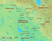 The Byzantines were successful at their endeavors, securing a noteworthy victory under the commanders Cours and John Mystacon, albeit also suffering a defeat at the hands of the Sasanians.[20] In early 580, the clients and vassals of the Sasanians, the Lakhmids, were defeated at the hands of the Ghassanids, vassals of the Byzantines.[20] In the same year, a Byzantine army ravaged Garamig ud Nodardashiragan, reaching as far as Media.[21][6] Around the same time, Bakur III, the Sasanian client king of Iberia, died, leaving behind two sons who were underage. Hormizd took advantage of the situation by abolishing the Iberian monarchy, i.e. the Chosroid dynasty. He appointed his son Khosrow as the governor of Caucasian Albania, who negotiated with the Iberian aristocracy and won their support, so successfully incorporating the country into the Sasanian Empire.[21][7][22]