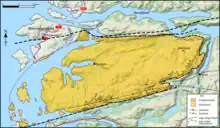 The northern margin of the basin is formed by a steep south-dipping fault that is interpreted to be mainly post-Devonian brittle structure that has formed close to the original basin edge. The southern margin is formed by the steep north-dipping Haukå Fault, which is interpreted to increase in displacement westwards, locally cutting out the alluvial fan deposits, although it is still regarded as being close to the original basin edge. The eastern margin is formed by a low-angle extensional fault, known as the Hornelen Detachment, part of the larger scale Nordfjord-Sogn Detachment (NSD). It juxtaposes the Devonian basin fill against mylonites of the NSD shear zone that underlies the basin.[1]