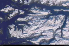 Satellite image of the Hornelen Basin, showing variation in the strike of bedding and the Grøndalen syncline at the southern margin