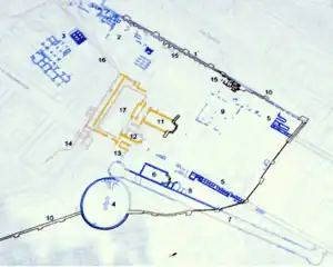 Plan Horti Spei Veteris 2: House of the mosaics 3:Baths, 5:circus basement 6:atrium 7:Pecile corridor 10:Aurelian walls 11:Sessorium 14:amphitheatre 15:domus Constantiana