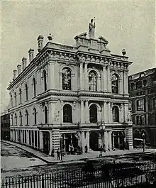 Horticultural Hall (1865–1901) of Boston, Massachusetts, was the headquarters of the Massachusetts Horticultural Society in the later 19th century. It stood at no.100-102 Tremont Street, at the corner of Bromfield Street, opposite the Granary Burying Ground.[1] Architects Gridley J.F. Bryant and Arthur Gilman designed the building.[2][3] Sculptor Martin Milmore created horticulturally-themed statuary for the building's exterior: "three ancient Roman goddesses ... Ceres, goddess of agriculture; Flora, goddess of flowers; and Pomona, goddess of fruit trees."[4] In the 1880s: "the ground floor [was] occupied by stores; the second story by the Library Room of the society and a hall for the weekly exhibitions; and the upper story by a large and elegant hall used ... at the annual and other important exhibitions. Both of these halls [were] often used for concerts and the better class of entertainments. The society's library, comprising over 4,000 volumes, [was] the most valuable collection of horticultural works in the United States. The halls [were] adorned with portraits and busts of the presidents, founders, and benefactors of the society."[5]