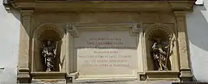 Under a niche with a statue of Saint Sebastian to the left of the entrance is a chronogram with the year 1674:
