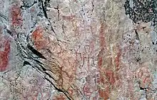 The Värikallio rock paintings are on a cliff near the eastern end of Lake Somerjärvi in the Hossa Hiking Area. Discovered in 1977 by two skiers, it is one of the two northernmost sites of rock art in Finland, as well as one of the largest collections with over 60 figures discerned. The human images at Värikallio are notable for exhibiting triangular heads (seen at only two other sites), and for a human figure with horns. As at other sites, the most numerous images are of animals, including one that may be the only bear depicted in Finnish rock art. Hand print and paw print pictographs are also represented. Another unusual aspect of the Värikallio paintings is the lack of boat images, which are common at other Finnish sites.[3]