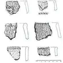 • Swanson cord-marked – represented by 13 rim sherds and 698 body sherds; grit-tempered, globular vessels with slightly elongated, semi-conoidal bases, cordmarked surface, vertical to slightly incurved rim profile, rounded and notched lips, and fingernail impressions at the base of neck. Similar pottery has been found at the Starved Rock and Zimmerman[2] sites in Protohistoric and early Historic contexts; and at Fisher[13] and Moccasin Bluff[12] in Prehistoric contexts. First defined at the Zimmerman site. Time period: Prehistoric to Protohistoric or early Historic. Cultural affiliation: Late Woodland.