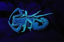 Bearing the typical buthid appearance, diagnosis of this species is decided by its colour. The sting, pedipalps and cephalothorax of the scorpion are all black. Both extremities of the scorpion form a gradient [4] fading from black to dark yellow, on the femur and sting segments. The legs of the scorpion are a bright yellow, forming a strong contrast. Much like all scorpions, the body will fluoresce if illuminated with ultraviolet light. Excluding the stinger, the body reaches a length of 50 mm,[5] and up to 90 mm if it is included