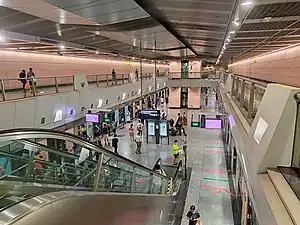 The platforms are wheelchair-accessible. A tactile system, consisting of tiles with rounded or elongated raised studs,[30] guides visually impaired commuters through the station.[31] Dedicated routes connect the station entrances to the platforms or between the lines.[32]