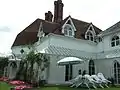 Houghton Lodge exemplifies this Cottage Ornée style; the principal reception rooms are placed on the ground floor, rather than on a piano nobile. The reception rooms, typical of the style, have french windows, shaded by a verandah, allowing immediate access to the garden. Many of Houghton's windows are in the exaggerated, decorative Gothic, almost Islamic, style which originated from the Walpole's Strawberry Hill Gothic.[6]