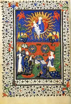 The Boucicaut master most likely discovered aerial perspective as witnessed by his mastery of it in this book of hours.[1] Master Boucicaut was interested in bright colors and their roles in creating expression and meaning in static forms.[1] In other words, he used bright colors to imply a certain mood. The artist concentrates on creating grouped forms that seem to have their own independent importance.[1] He paints the forms in a way that seems like the individual could be displaced from the group and still have context.[1] Through his composition Master Boucicaut introduces the concept of depicting biblical scenes as earthly events.[1] In the scenes Flight into Egypt[3] and Pentecost,[4] a shepherd off in the distance with his flock places the foreground scene in the context of the real world.[1] This implies the foreground event is in "reality" rather than a purely celestial moment.