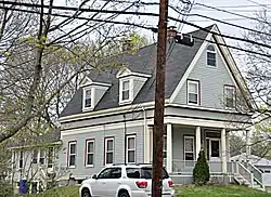 The House at 307 Lexington Street in Newton, Massachusetts, is a well-preserved small-scale Greek Revival house. The 1+3⁄4-story wood-frame house was built c. 1860, and has a steeply pitched gable roof with paired gable dormers on the side, and a round-arch window at the top of the gable (an Italianate feature). The front gable hangs over a full-width porch supported by Doric columns. A classic entablature encircles the house.[2]