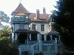 It was built in 1890, and is a large, three-story residence with a prominent cross-gable roof designed in the Queen Anne style. A porch and tower were added to the home in 1978; a kitchen extension was added in 2015. Also on the property is a two-bay brick garage built in 1918.[2]