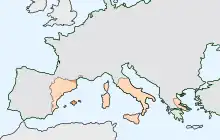 Location of the Kingdom of Majorca in relation to the other territories that comprised the Crown of Aragon in the 15th century.