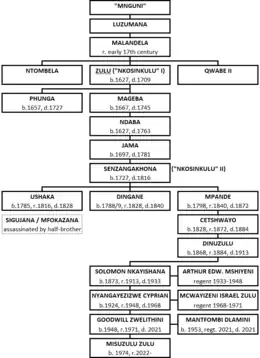 Genealogy of the Zulu kings. Sources vary concerning the earlier kings (shown without dates)