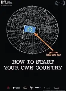 How to Start Your Own Country is a 2010 Canadian documentary film directed by Jody Shapiro and written by Shapiro and Denis Seguin. Produced by Phyllis Laing and Shapiro, the film explores various aspects of micronationalism and features interviews with several prominent micronationalists. The production studios for the film are Buffalo Gal Pictures and Everyday Pictures. How to Start Your Own Country had its world premiere at the 35th Toronto International Film Festival on 10 September 2010.[1][2][3]