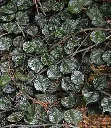 Hoya curtisii is a species of flowering plant in the genus Hoya. It is native to Southeast Asia across Thailand, the Philippines, Borneo, and Malaysia.[1] The species has easily recognizable foliage among Hoyas with small, pointed leaves and silver variegation. Like many Hoyas, it grows as a creeping epiphyte.[2]
