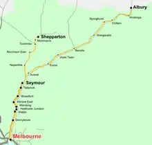 From 1 July 1994 the company was contracted with the Department of Transport to provide 26 services each week. These included four trains and two buses (two and one each way) Melbourne to Shepparton Monday to Saturday, with one train each way on Sundays. A bus connection were made to Cobram, with some buses extended to Tocumwal.[4] A six-month trial was also made for bus services to Finley and Berrigan in New South Wales, and a service to Griffith was later introduced.[6]