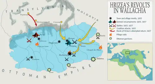 The Wallachian truce was again endangered after less than two years. In December 1656, Captain Priboi, probably as a Hrizea partisan, tried to assassinate Constantin, before being stopped by the Transylvanian bodyguards.[87] In early 1657, Rákóczi intervened in the Swedish Deluge, which caused him to be absent from the capital and sparked a succession crisis at home.[88] During this interval, as many as 500 Seimeni exiles, whom Rákóczi had left in charge of the city defenses,[89] helped their leader break out of prison. They managed to do so on March 23, 1657, while Hrizea was praying in church.[90] Hrizea, with his family and his retinue, rode to Hermannstadt. He could not enter that city, being harassed by local Transylvanian Saxons and Romanians, but eventually crossed the Olt River.[91]