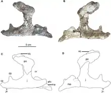 In 2015, several distinguishing traits were established. Five of these were autapomorphies, unique derived qualities. The rear branch of the jugal bone, running below the opening of the infratemporal fenestra, bears a distinctive process obliquely pointing to above and behind. The quadrate bone is robust with an expanded facet contacting the quadratojugal bone. Above the facet with the quadratojugal, the front edge of the quadrate is transversely expanded. Near the lower edge of the quadrate a distinctive notch is present. The dentary bone of the lower jaw is deep and short.[1]