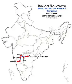 The Hubballi–Secunderabad Express is an Express train belonging to South Western Railway zone[1] that runs between Hubli Junction and Secunderabad Junction in India. It is currently being operated with 17320/17319 train numbers on a daily basis.[2][3][4]
