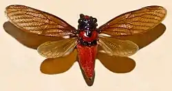 Huechys sanguinea, commonly known as the black and scarlet cicada, is a species of cicada belonging to the family Cicadidae.