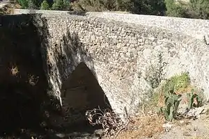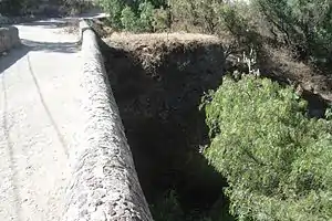 This structure is represented by a stone masonry pre-Hispanic bridge. Its overall length at the top is about 21.5 meters long by 4.9 meters wide (70 by 16 ft.). It has an equilateral pointed arch type construction, measures some 16 meters long, by 5 meters wide. The bridge top is about 15 meters over the ravine and river below and has a clear span of about 7 meters and it keystone is about 8 meters high.[1]
