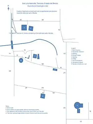 Although a few buildings remain in Huexotla, it was a very large city that extended well beyond the perimeter wall, in fact, the only known structure of its kind in the region from the late postclassical. It is believed that the Huexotla main structure once existed at the place where the Franciscan convent and the Church of St. Louis were built.[3]