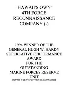 The Marine Reserves award — the General Hugh W. Hardy Superlative Performance Award — was established in 1998 as an annual award to be presented to the most outstanding Reserve Force Level Asset Unit.[1]
