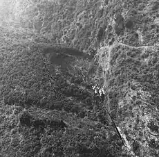 The stricken airliner crashed onto Mount Bliss in the San Gabriel Mountains at an elevation around 3,000 feet (900 m),[13] where the bulk of the wreckage landed in a gorge.[10] Fire department officials sent search and rescue helicopters[14] to the crash site, but efforts were hampered by thick fog.[10][15] Nine bodies were initially found at the crash site,[10] a number of them intact and still strapped into their seats.[13] News reports indicated that these bodies had apparently been thrown clear on impact, and had come to rest alongside the tail section of the aircraft.[12]