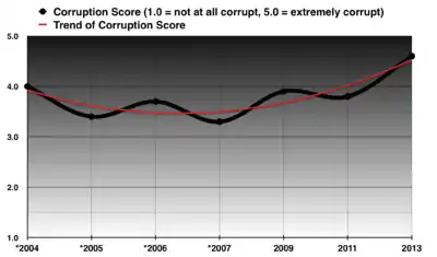 Under Chávez, Venezuela experienced democratic backsliding.[24][25][26] His use of enabling acts[27] and his government's use of propaganda were controversial.[28][29][30][31] Chávez's presidency saw significant increases in the country's murder rate[32][33] and continued corruption within the police force and government.[34][35]