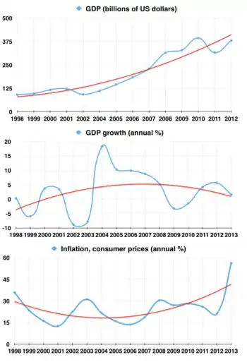 Following the adoption of a new constitution in 1999, Chávez focused on enacting social reforms as part of the Bolivarian Revolution. Using record-high oil revenues of the 2000s, his government nationalized key industries, created participatory democratic Communal Councils and implemented social programs known as the Bolivarian missions to expand access to food, housing, healthcare and education.[6][7][8][9][10][11] The high oil profits coinciding with the start of Chavez's presidency[12] resulted in temporary improvements in areas such as poverty, literacy, income equality and quality of life between primarily 2003 and 2007,[13][12][14] though extensive changes in structural inequalities did not occur.[15] On 2 June 2010, Chávez declared an "economic war" on Venezuela's upper classes due to shortages, arguably beginning the crisis in Venezuela.[16] By the end of Chávez's presidency in the early 2010s, economic actions performed by his government during the preceding decade, such as deficit spending[17][18][19] and price controls,[20][21] proved to be unsustainable, with Venezuela's economy faltering. At the same time, poverty,[12][22] inflation[23] and shortages increased.