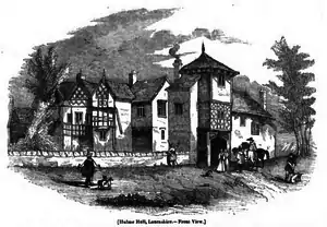 The building was owned by John de Hulme during the reign of Henry II[1] and by the de Rossindale family by the time of Edward I.[3] During the reign of Henry IV, it was owned by a branch of the family of Prestwich baronets and remained with them for centuries, with a five-year interlude when it was in the possession of Henry de Byrom. Sir Thomas Prestwich sold it to Sir Edward Mosley, 2nd Baronet, in 1660–61. Mosley died without a direct heir at the age of 27 in 1665 and there then followed much litigation regarding his estate, made more complex by various subsequent deaths.[1][4] In 1695, ownership passed to John Bland, a member of the Bland baronets and Member of Parliament for Lancashire between 1713 and 1727. Bland had married Mosley's sole surviving heir, Anne.[1][4][5][lower-alpha 1] According to Edward Baines, around this time the hall was "among the most stately residences in the parish of Manchester".[6]