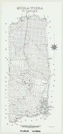 1. 1 2 "Placename Details: Hundred of Mudla Wirra". Property Location Browser. Government of South Australia. 29 January 2009. SA0047381. Archived from the original on 7 December 2015. Retrieved 6 November 2017. Other Details: Area 109 1/2 square miles. According to Noel Webb, Mudla Wirra is taken from Mudla meaning implements and Wirra meaning forest and therefore means a forest from which implements are taken.