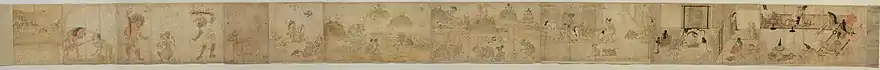 The Hungry Ghosts Scroll kept at the Kyoto National Museum depicts the world of the hungry ghosts and the suffering of these creatures, and contains tales of salvation of the ghosts. The whole scroll has been designated as National Treasure of Japan and it was possibly part of a set of scrolls depicting the six realms which was kept at Sanjūsangen-dō.[18]